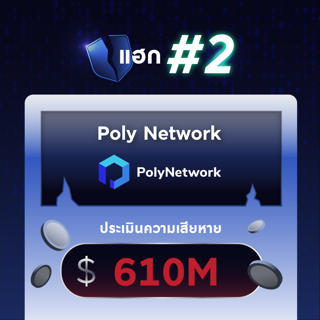 การโดนแฮ็กอันดับรองลงมา แต่เกิดขึ้นก่อนและทำให้ผู้คนต่างตกใจมากเพราะเป็นครั้งแรกที่แพลตฟอร์มคริปโตถูกแฮ็กไปด้วยมูลค่ามหาศาลแบบนี้ “Poly Network” แพลตฟอร์มผู้ให้บริการโอนข้ามเหรียญระหว่างเครือข่าย (Bridge Protocol) โดยช่องโหว่เกิดจากฟังก์ชั่น Cross-chainใน Smart contract ที่สามารถเปลี่ยนบัญชีผู้ดูแลเงินได้ ทำให้แฮกเกอร์นำบัญชีตัวเองเข้ามาสวมและสั่งโอนเงินออกไปได้อย่างอิสระ ซึ่งมูลค่าที่โอนออกไปก็คือ 610 ล้านเหรียญดอลล่าร์สหรัฐ