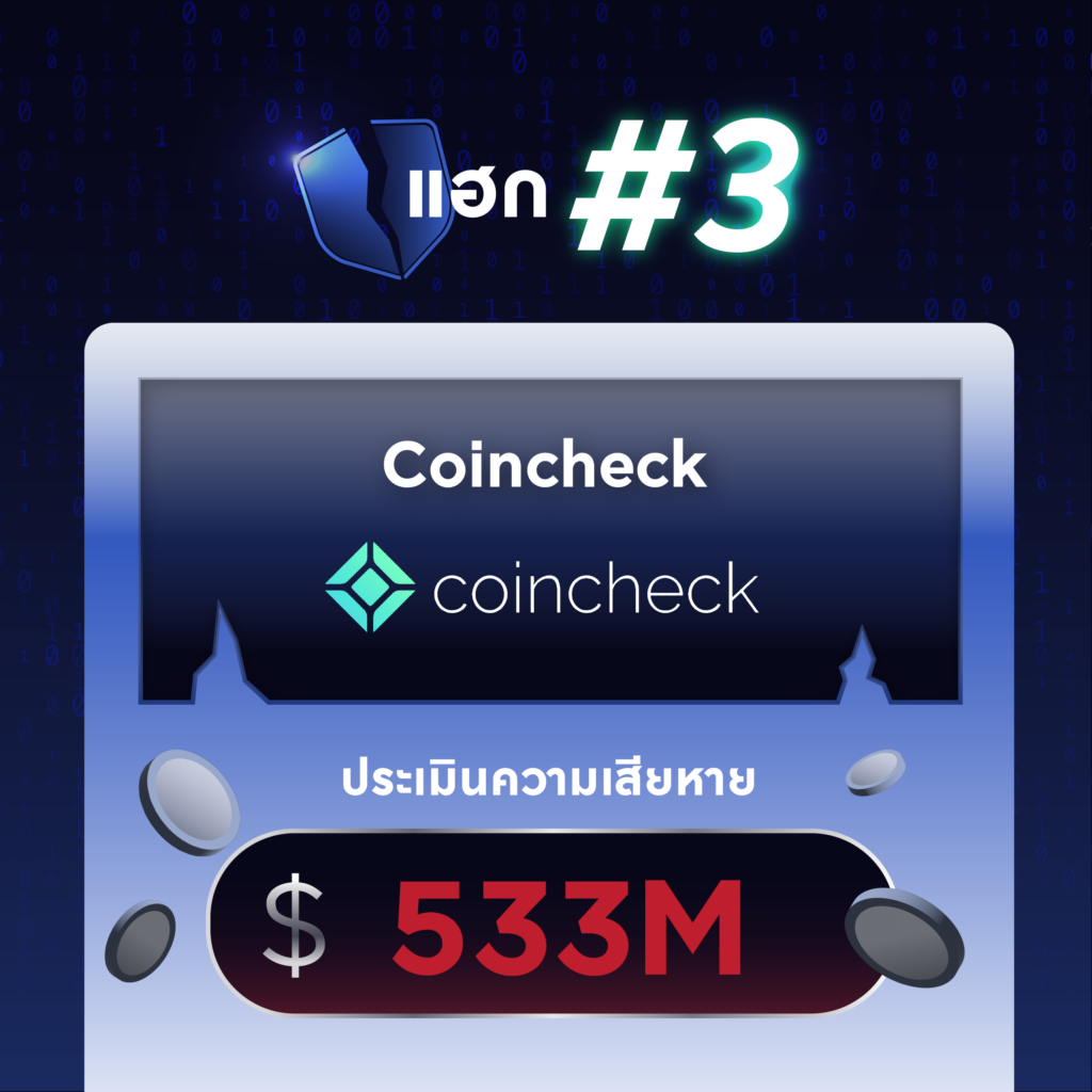 อันดับสุดท้ายที่ยกตัวอย่างมาให้อ่านกันคือ Coincheck ศูนย์แลกเปลี่ยนเงินสกุลดิจิทัลในประเทศญี่ปุ่น ถูกแฮกเหรียญสกุล NEM 523 เหรียญ ซึ่งเป็นมูลค่ากว่า 533 ล้านเหรียญสหรัฐ โดยแพลตฟอร์มพบการโอนสิทนทรัพย์จากบัญชีน่าสงสัยส่ง NEM ออกไปยัง 11 วอลเลท ซึ่งกว่าจะพบว่าเป็นการแฮกก็ล่วงเลยไปครึ่งวันแล้ว