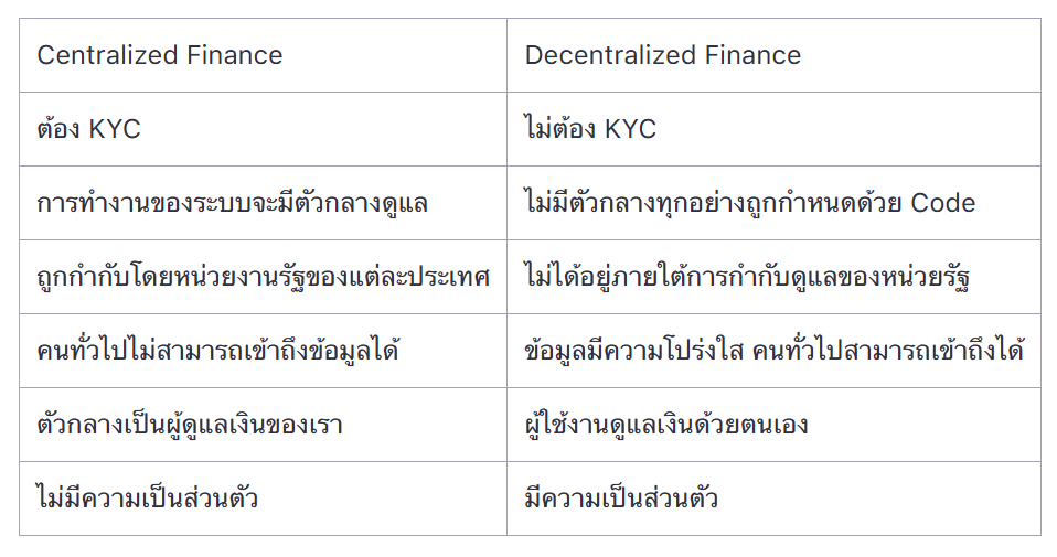 เพื่อให้เห็นภาพชัดเจนระหว่างโลกการเงินแบบเก่าและโลกยุคใหม่ เรามาดูความแตกต่างระหว่างระบบกระจายอำนาจ (Decentralized) และระบบรวมศูนย์ (Centralized) ในด้านต่าง ๆ ดังนี้