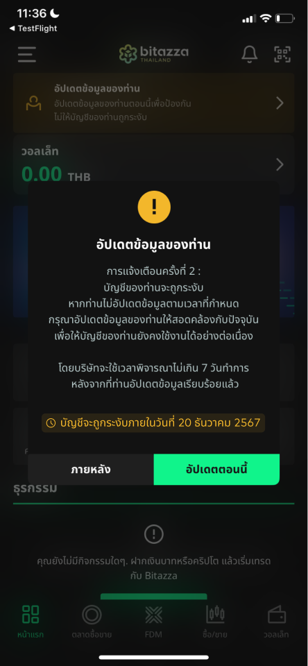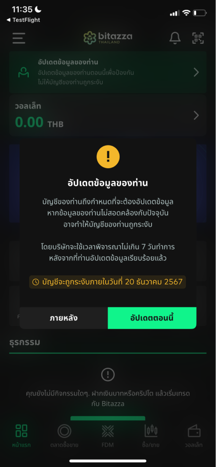 หากลูกค้าไม่ดำเนินการตามคำขอในเวลาที่กำหนด บัญชีของท่านจะถูกระงับการใช้งานชั่วคราว โดยไม่สามารถทำธุรกรรมซื้อขาย ถอนเงินบาทหรือสินทรัพย์ดิจิทัลได้ อย่างไรก็ตาม สินทรัพย์ของท่านยังคงปลอดภัย
